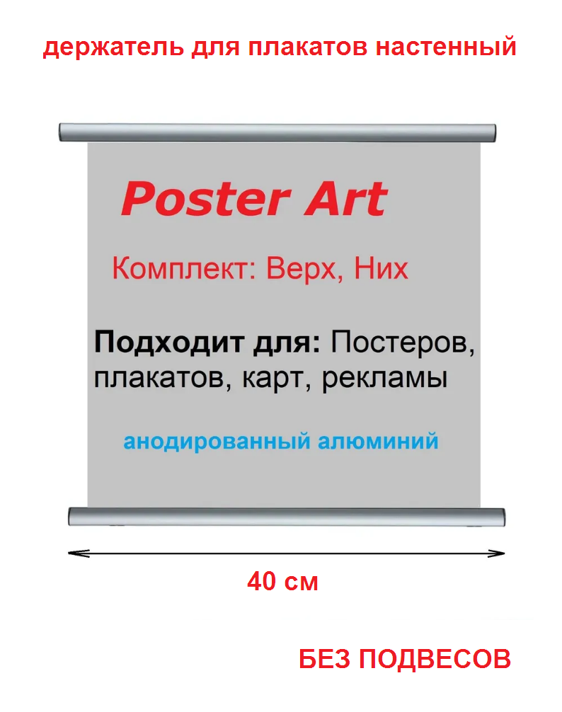 В комплекте два профиля с торцевыми пластиковыми заглушками, без подвесов.  Верхний профиль выполняет роль плотного зажима. Выдерживает вес полотна до 3-3,5кг. Нижний служит утяжелителем. Смена постера в такой конструкции занимает меньше минуты. Держатель хорошо выдерживает внешние воздействия и идеально подходит для многократного применения.